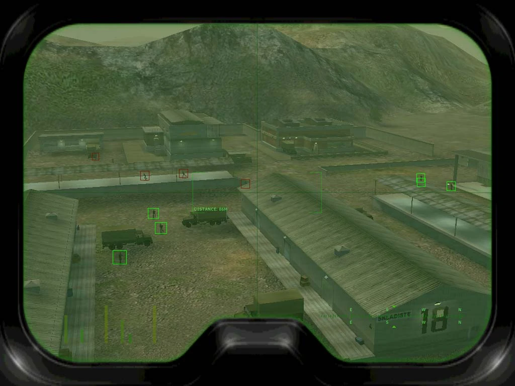 In IGI 2, the binoculars do not show any highlights, and the player must recognize enemies on his own, although the Thermal Goggles can be used separately for this purpose. The crosshair is removed, but it's still possible to snipe enemies if one places them right in the middle of the screen.